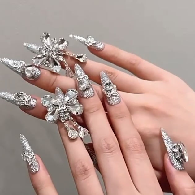 🎀 Silver Butterfly 2 in 1 Long Almond Luxury Handmade Press On Nails