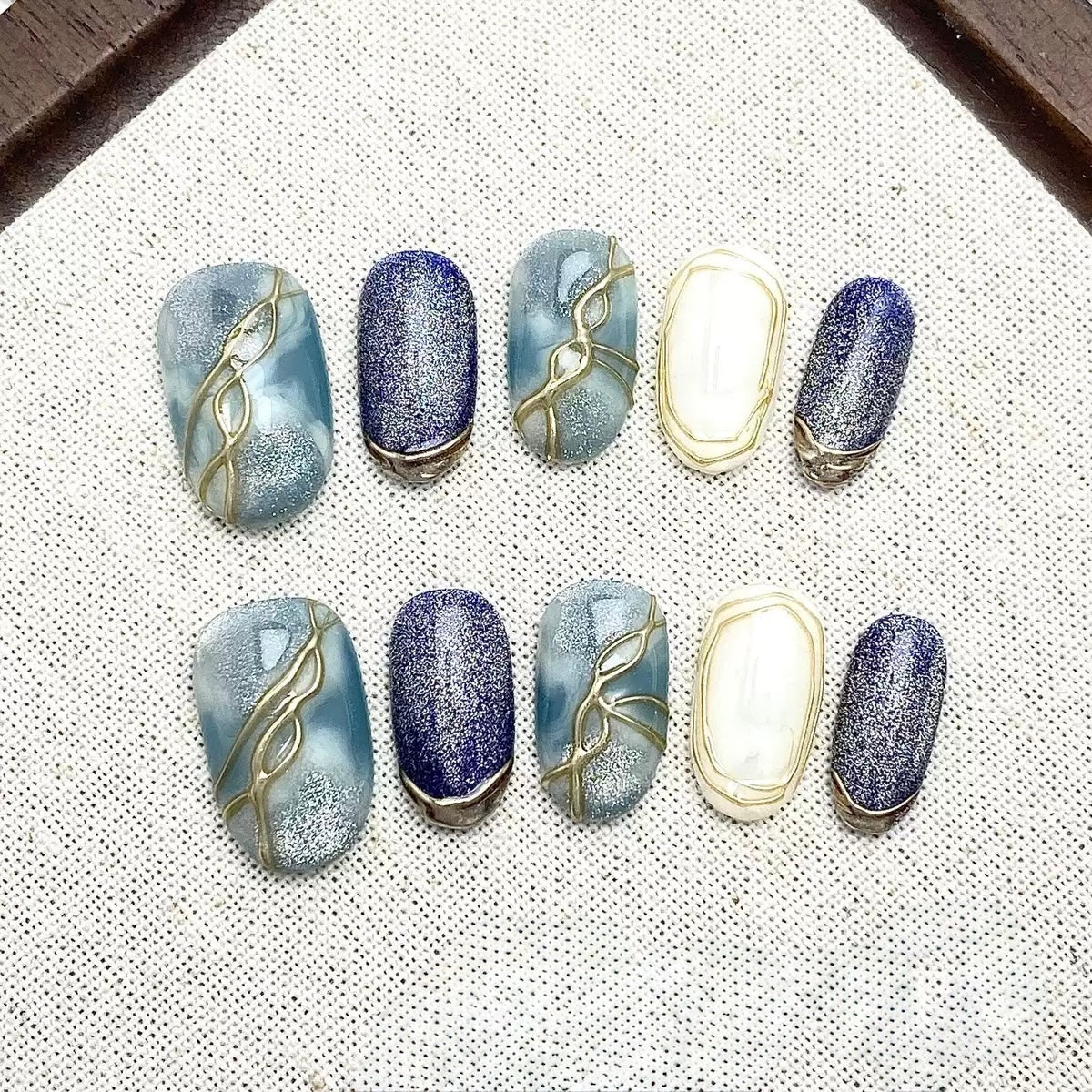 🎀 Blue Stone Medium Oval Fairy Chic Handmade Press On Nails