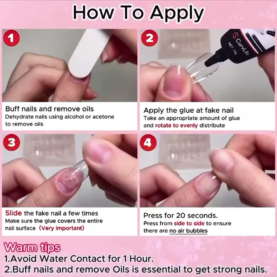 - Apply glue to both your nail and the press-on nail, or slide the press-on slightly 2–3 times when applying to evenly spread the glue.