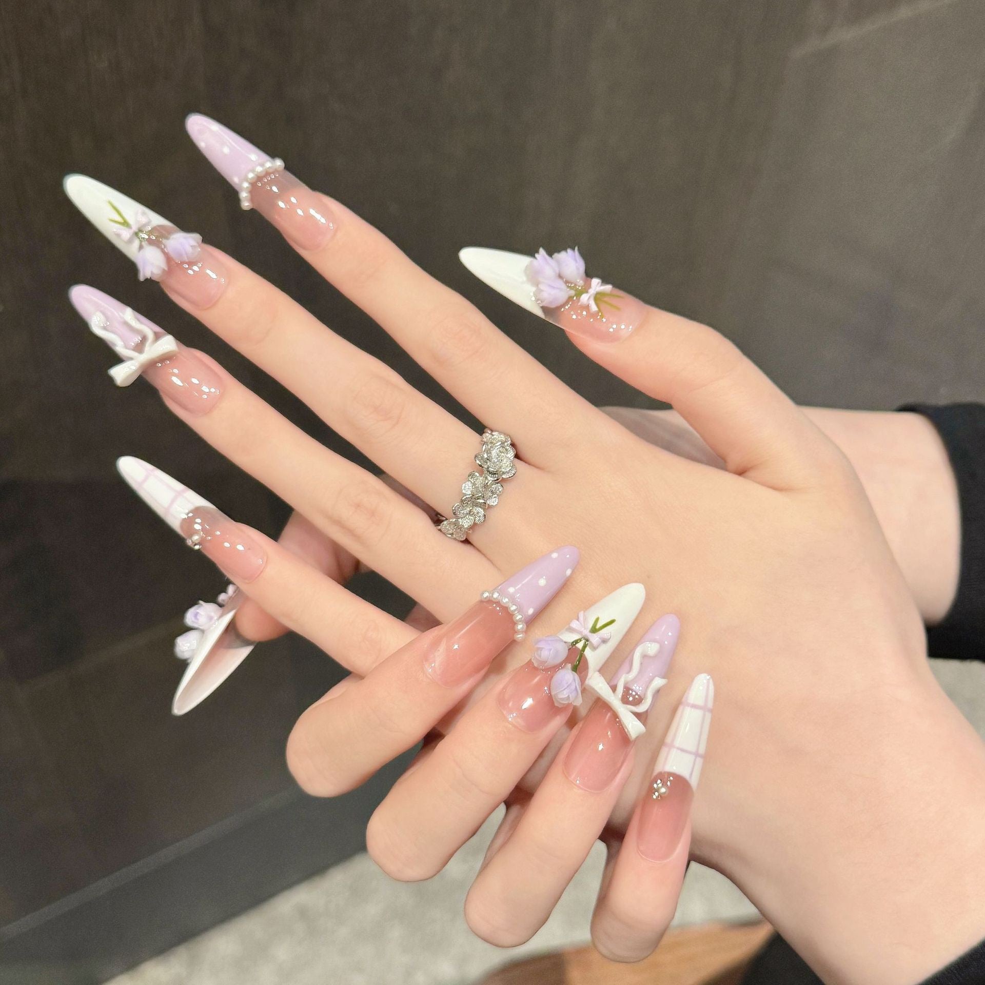 🎀 Purple Rose Long Almond Party Handmade Press On Nails