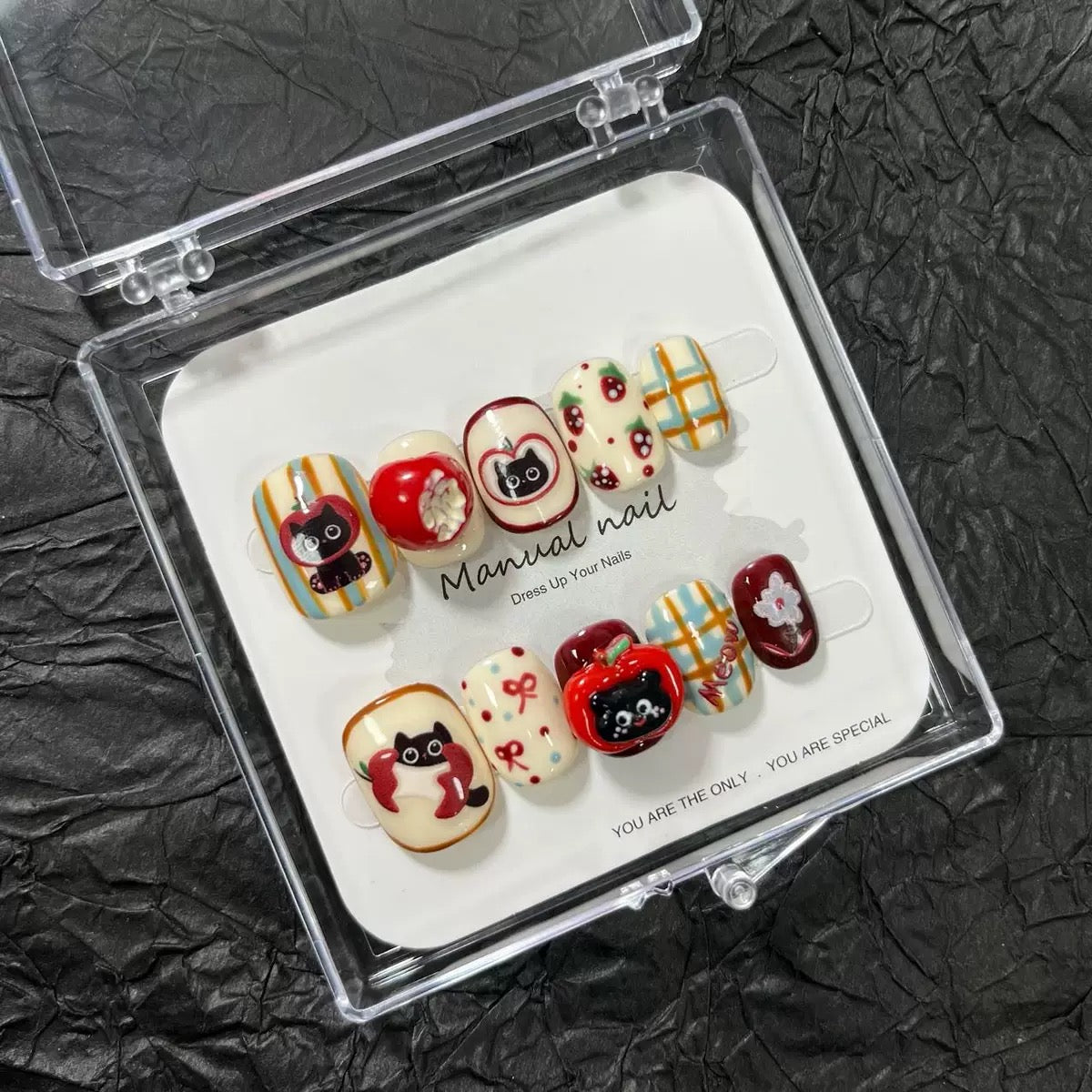 Black Cat & Apple - Cute Kawaii Handmade Press On Nails