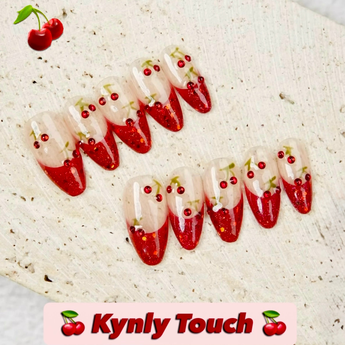 🎀 Cherry Red French Medium Almond Handmade Press On Nails
